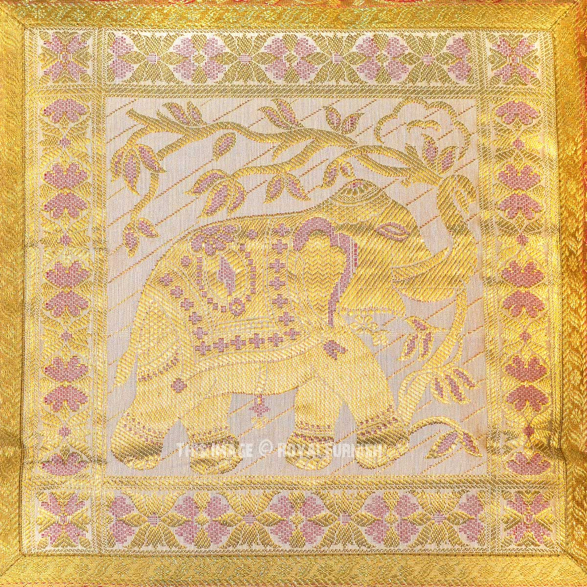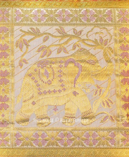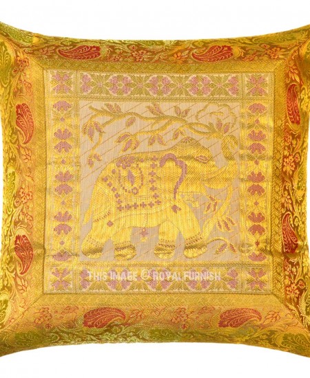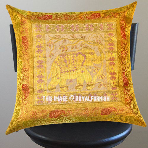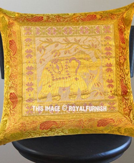 Yellow Indian Elephant Silk Brocade Throw Pillow Cover