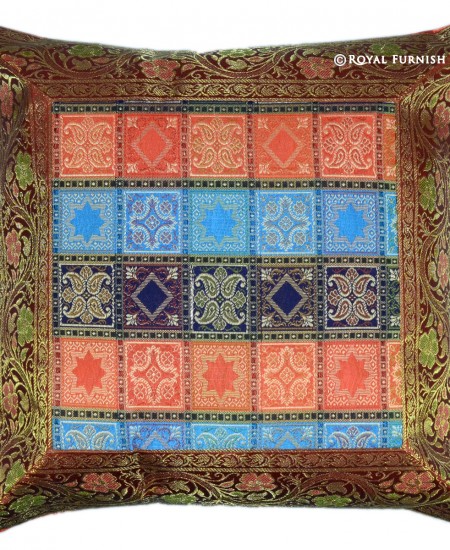 16" Multicolor Square Box Indian Silk Brocade Throw Pillow Case