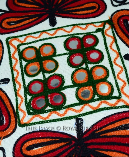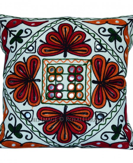 Brighten up the dull ambiance of your living room with woolen threads embroiderd throw pillow featuring elephants & dancing people theme. The embroidery work is done with multicolor woolen threads. The vibrant color and design will not fail to leave a lasting impression on your guests. It is antique and rarely find such fine embroidery work on cushion cover.