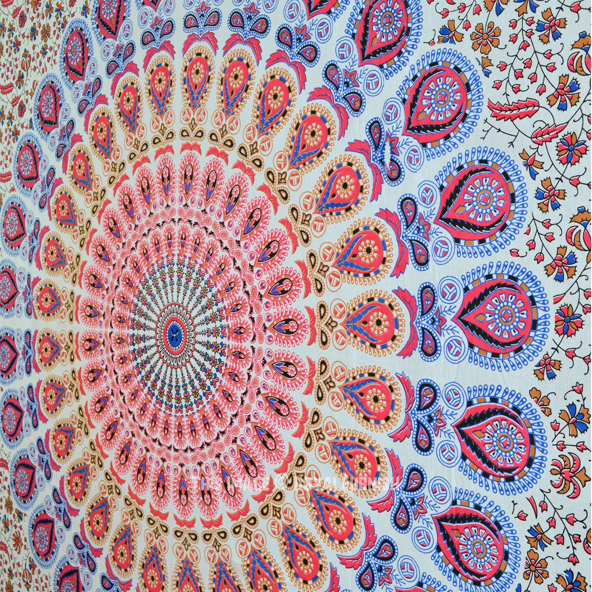 Colorful Peacock Wings White Bohemian Mandala Tapestry Wall Hanging