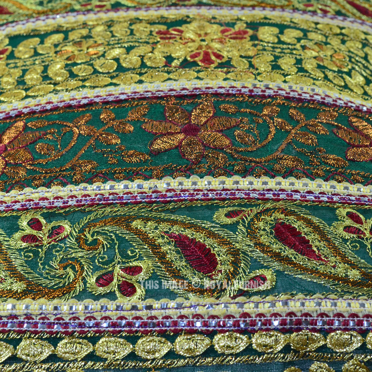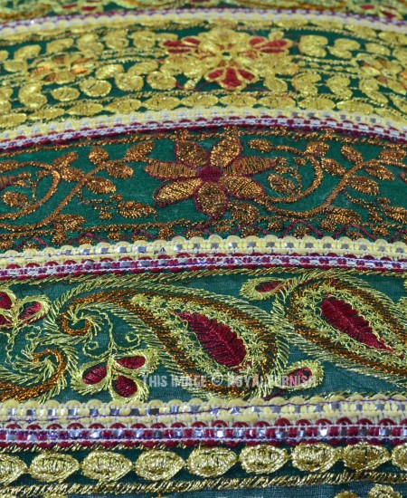The beautiful India handicraft floral Silk pillow is made in India. The hand embroidered threads delivers it a rich look. Add it on home furniture it will add warmth, color and traditional style to any room. The traditional styles of thread embroidery developed in Rajasthan and Gujarat are displayed here with remarkable craftsmanship and expertise! Witness the meticulous thread and sequin work in multiple colors and the magnificent image of India's beloved !