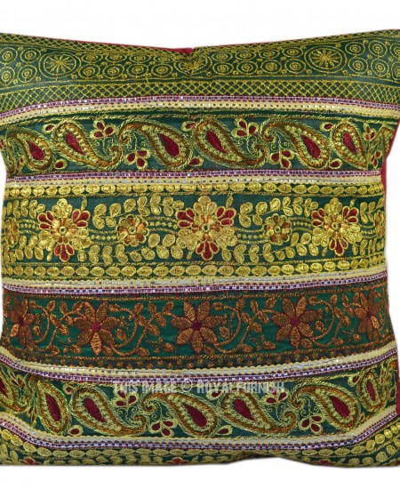 Antique Golden Thread Sequin Embroidered Indian Decorative Silk Throw Pillow