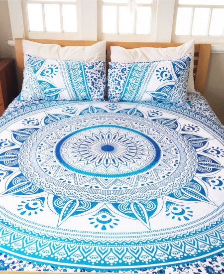 White & Blue King Ombre Medallion Mandala Duvet Cover with Set of 2 Pillow Covers