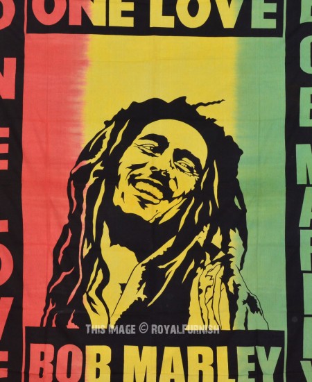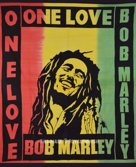 The gorgeous piece of art features Bob Marley Singing Bob (One Love) in Rasta colours will enhance the look and feel of your home interior. This gorgeous piece of art can be used as Bedspread, Bed Cover, Table Cloth, Curtain and of course as a Reggae Tapestry or a Wall Hanging. The tapestry is completely screen printed in traditional Indian method and takes around a week to complete. As it is handicraft item so there may be slight variation from one to next tapestry.