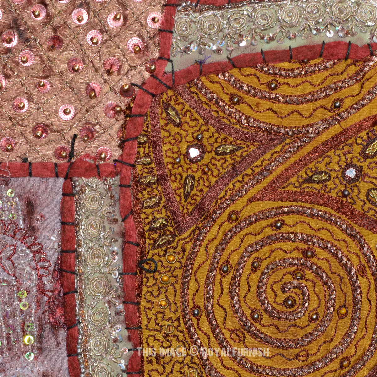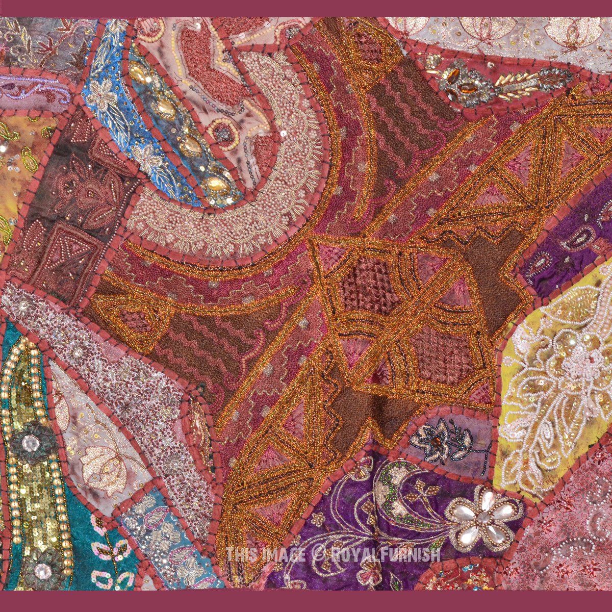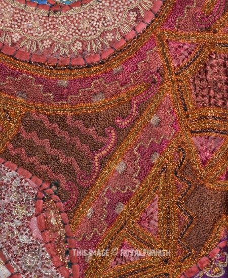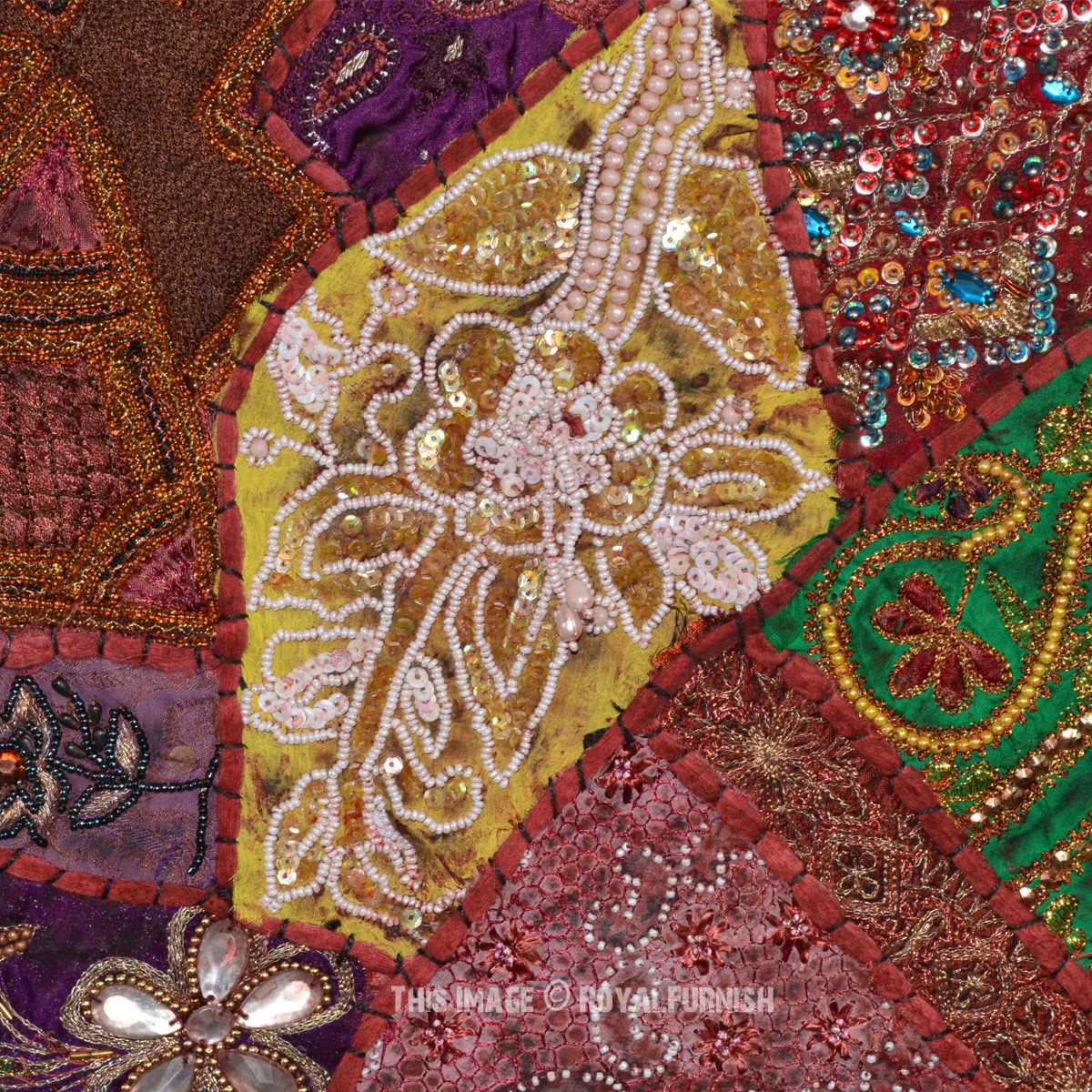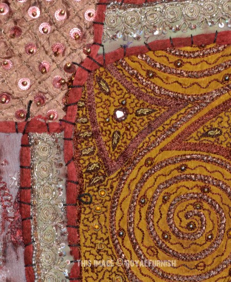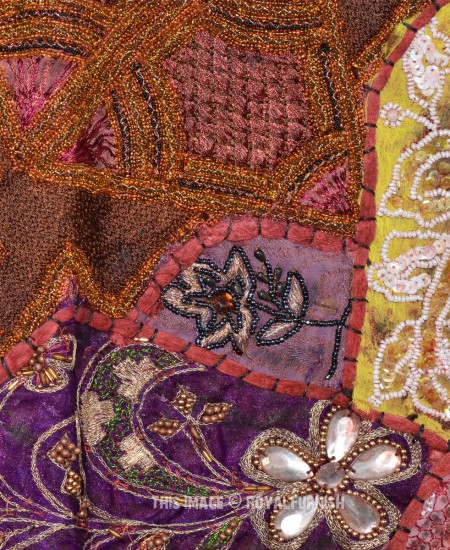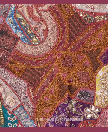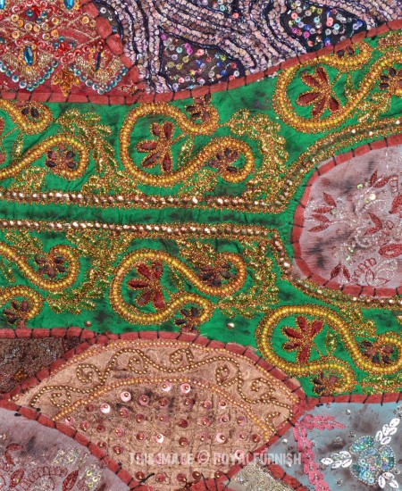 Create a beautiful centerpiece or focal point into any room with intricate heavy beaded patchwork design wall tapestry which comprises kundan lace, moti (Beads) and different patches from Indian expensive bridal gowns. Walls are integral part of any house to enhance the home interior. To change the mood of home interior hang the beautiful Indian havy beads work patchwork and hand embroidered tapestry to re-vamp the walls and improve the over-all ambience and decor. It contains interesting and ethnic vintage look which reminds you cultural history of royal rajasthan. The heavy beaded tapestry is made with Antique bridal dresses, faux stones, faux pearls, beads, lace and expensive bridal gowns or sari cutted into small pieces and all pieces are joint perfectly with hand sewn threads embroidery.