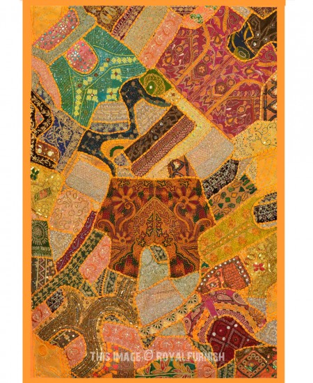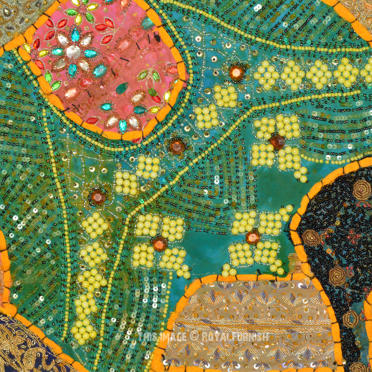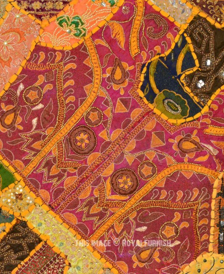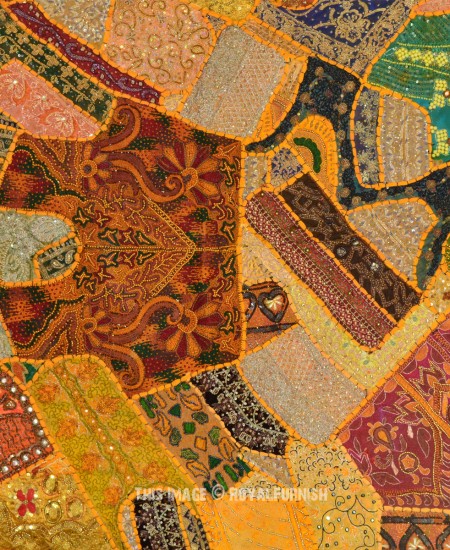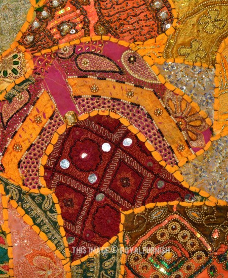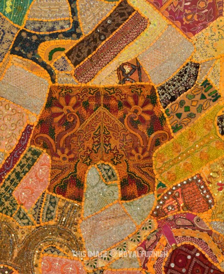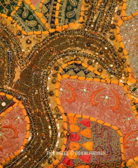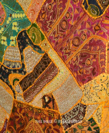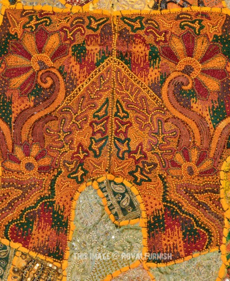 Create a beautiful centerpiece or focal point into any room with intricate heavy beaded patchwork design wall tapestry which comprises kundan lace, moti (Beads) and different patches from Indian expensive bridal gowns. Walls are integral part of any house to enhance the home interior. To change the mood of home interior hang the beautiful Indian havy beads work patchwork and hand embroidered tapestry to re-vamp the walls and improve the over-all ambience and decor. It contains interesting and ethnic vintage look which reminds you cultural history of royal rajasthan. The heavy beaded tapestry is made with Antique bridal dresses, faux stones, faux pearls, beads, lace and expensive bridal gowns or sari cutted into small pieces and all pieces are joint perfectly with hand sewn threads embroidery.