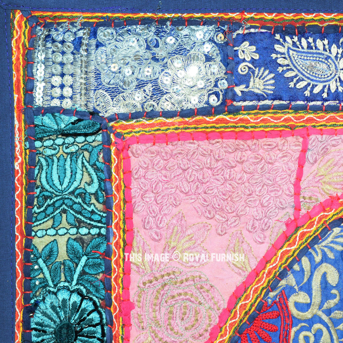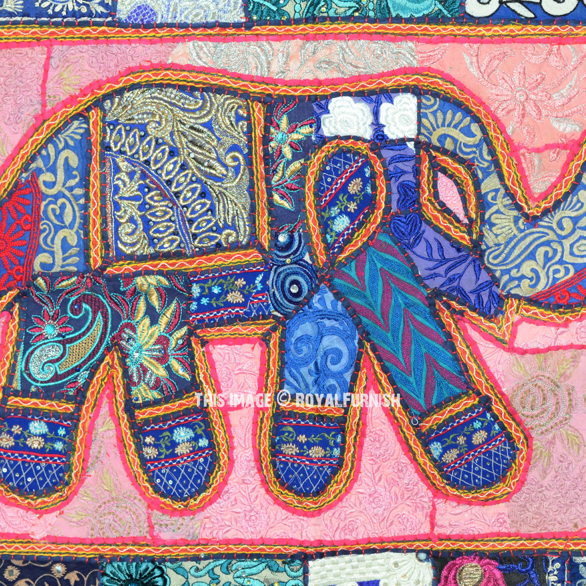 Based on the traditional techniques developer in Rajasthan, India, this wall hanging is handcrafted of recycled patchwork material, sewn together with cotton. Artisans designs this wall hanging, depicting a fabulous elephant and finishes it with intricate floral zari embroidery alongside beads and sequins. A floral motif border surrounds the central image.