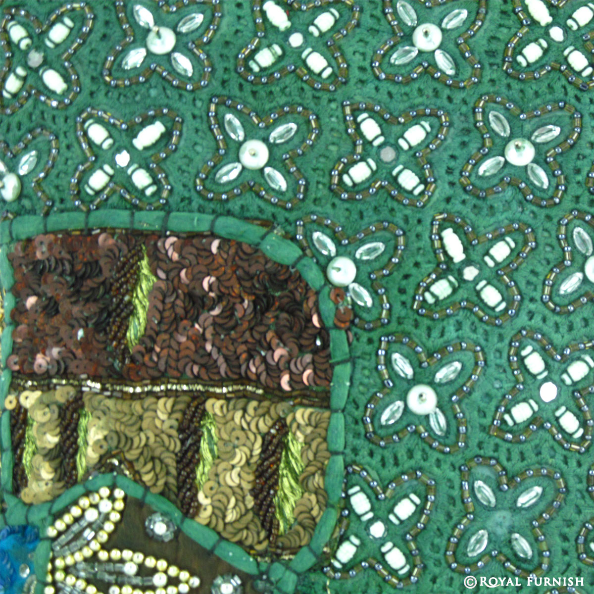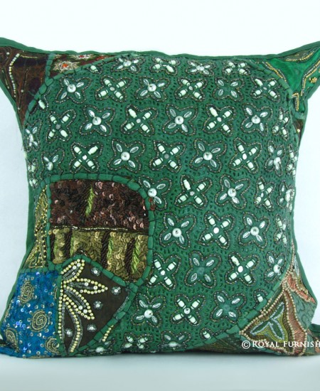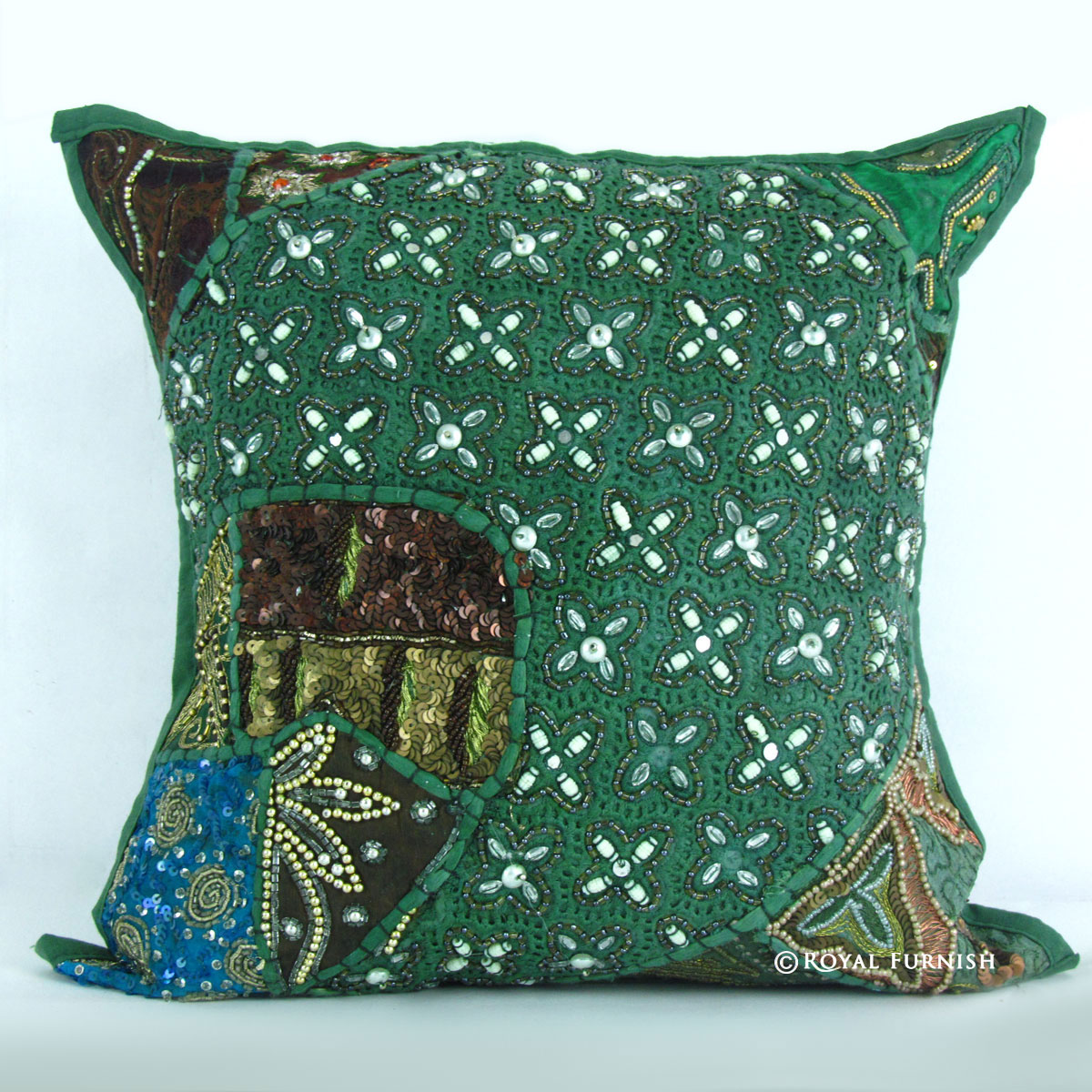 Antique Unique Green Beaded Embroidered Cotton Throw Pillow Case Sham