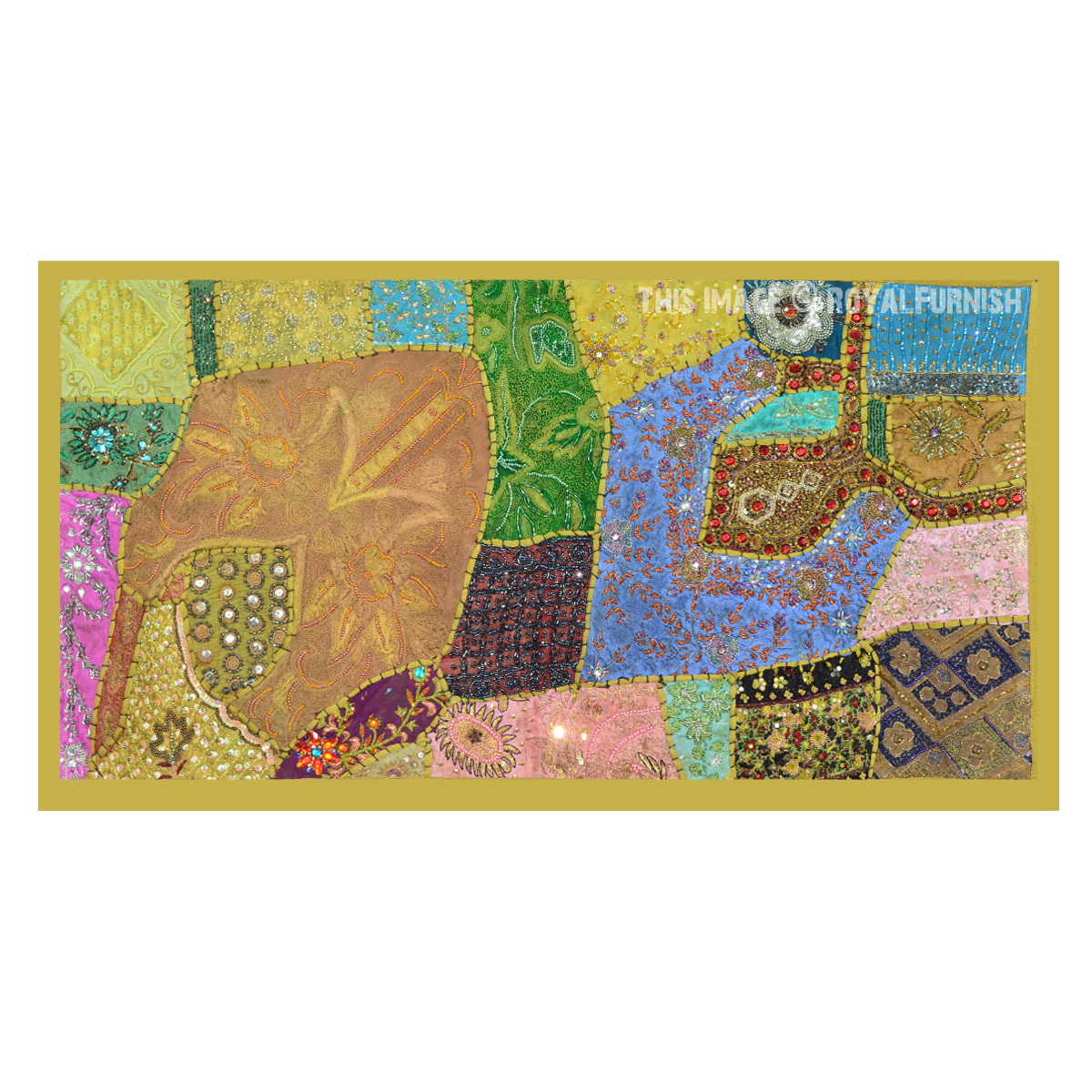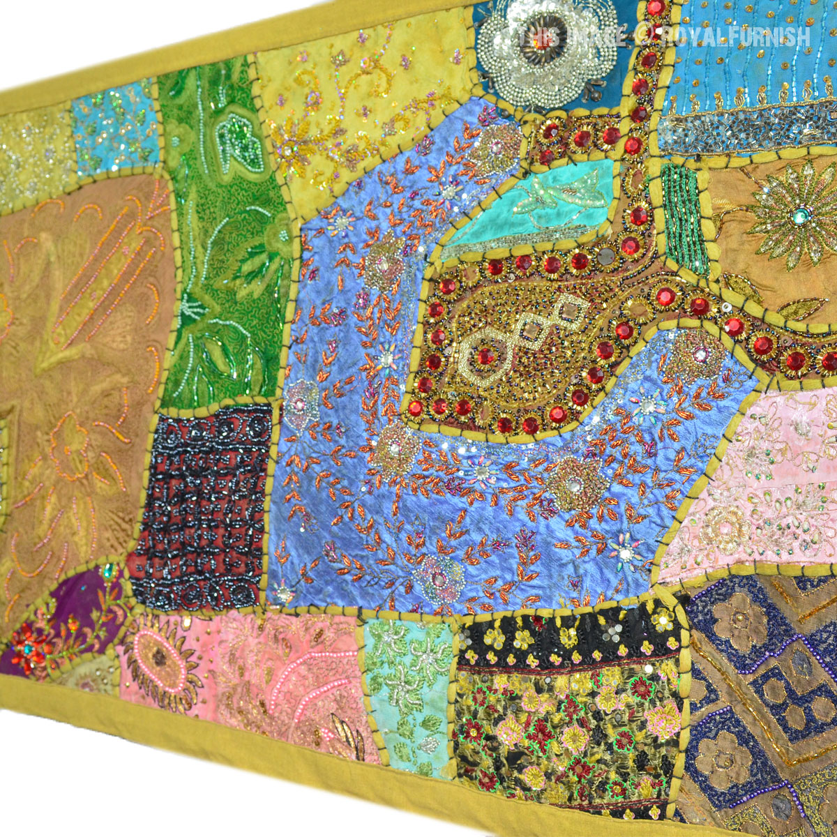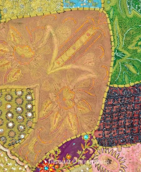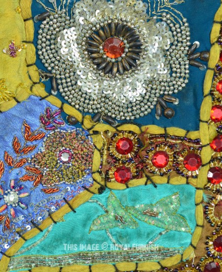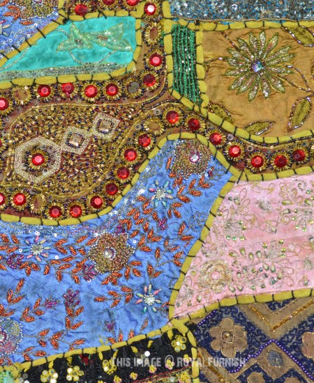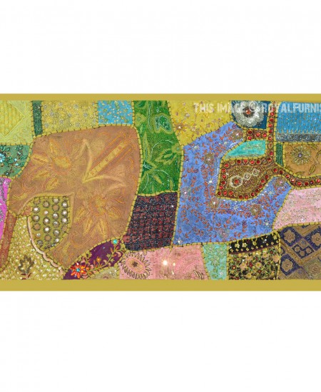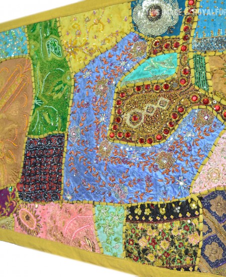 Create a beautiful centerpiece or focal point into any room with intricate heavy beaded patchwork design wall tapestry which comprises kundan lace, moti (Beads) and different patches from Indian expensive bridal gowns. Walls are integral part of any house to enhance the home interior. To change the mood of home interior hang the beautiful Indian havy beads work patchwork and hand embroidered tapestry to re-vamp the walls and improve the over-all ambience and decor. It contains interesting and ethnic vintage look which reminds you cultural history of royal rajasthan. The heavy beaded tapestry is made with Antique bridal dresses, faux stones, faux pearls, beads, lace and expensive bridal gowns or sari cutted into small pieces and all pieces are joint perfectly with hand sewn threads embroidery.