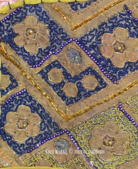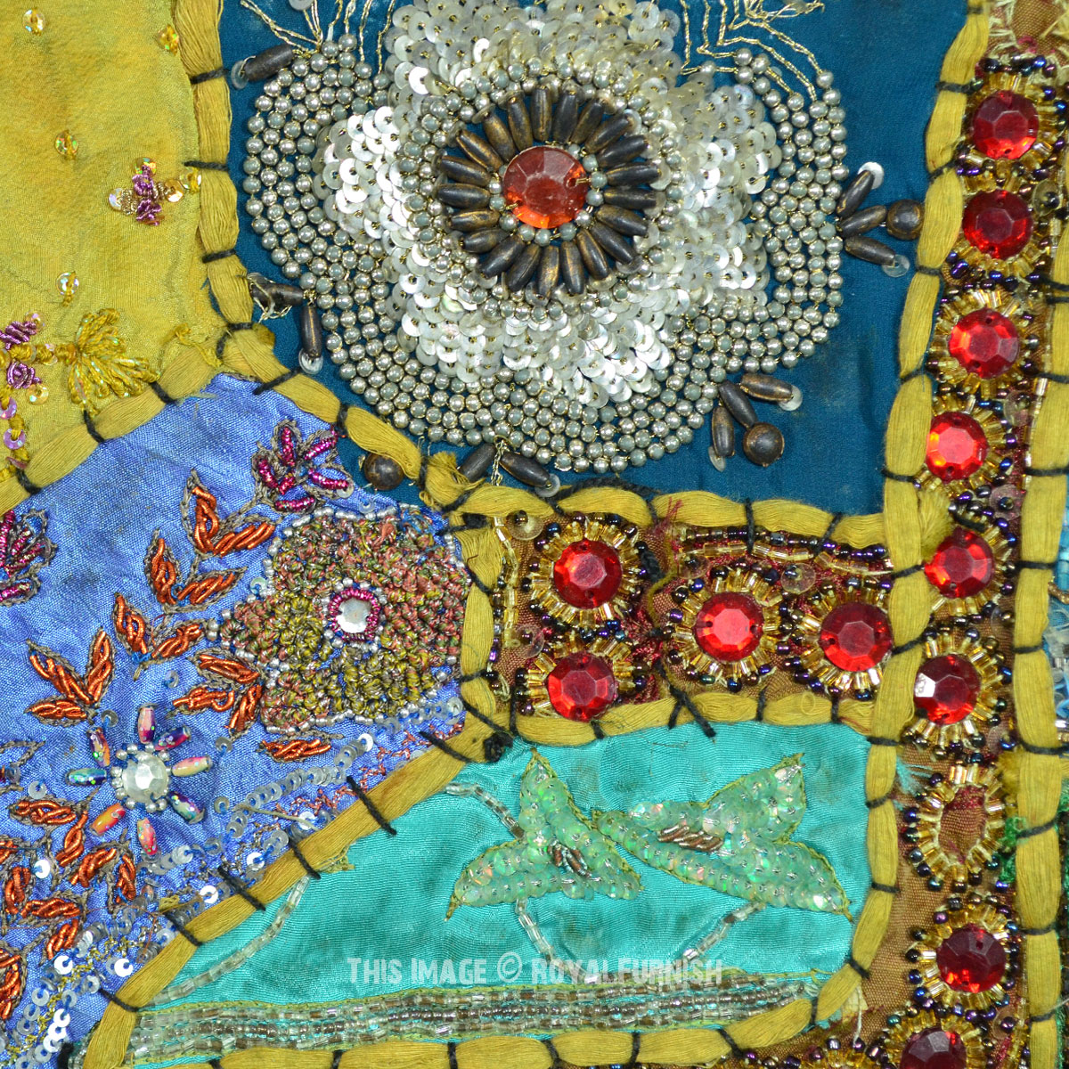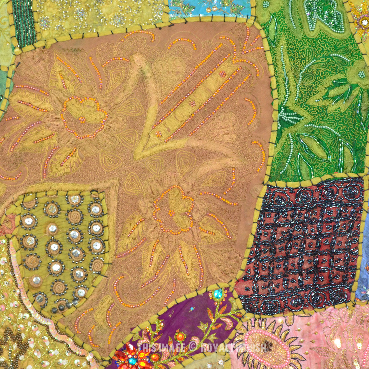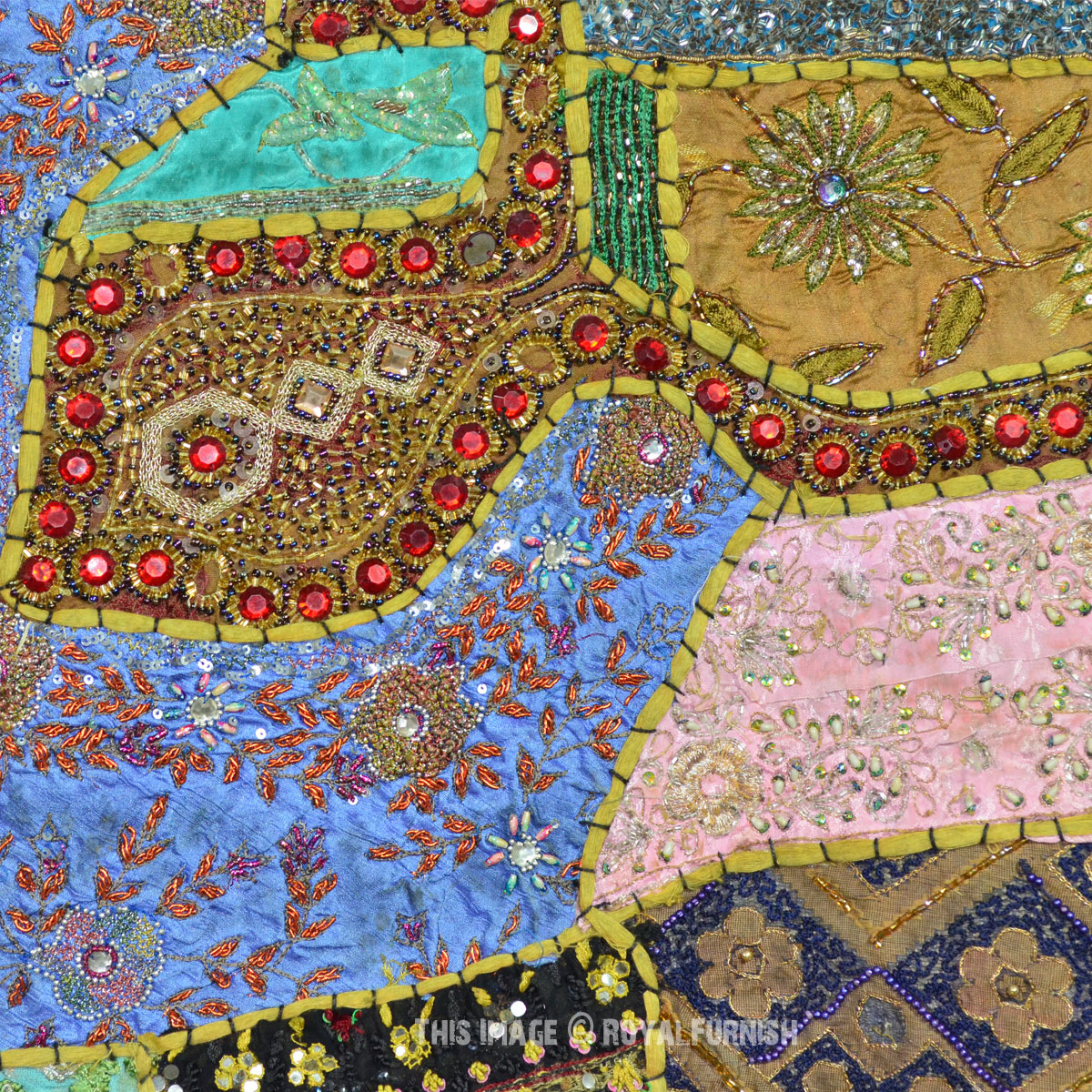 Create a beautiful centerpiece or focal point into any room with intricate heavy beaded patchwork design wall tapestry which comprises kundan lace, moti (Beads) and different patches from Indian expensive bridal gowns. Walls are integral part of any house to enhance the home interior. To change the mood of home interior hang the beautiful Indian havy beads work patchwork and hand embroidered tapestry to re-vamp the walls and improve the over-all ambience and decor. It contains interesting and ethnic vintage look which reminds you cultural history of royal rajasthan. The heavy beaded tapestry is made with Antique bridal dresses, faux stones, faux pearls, beads, lace and expensive bridal gowns or sari cutted into small pieces and all pieces are joint perfectly with hand sewn threads embroidery.